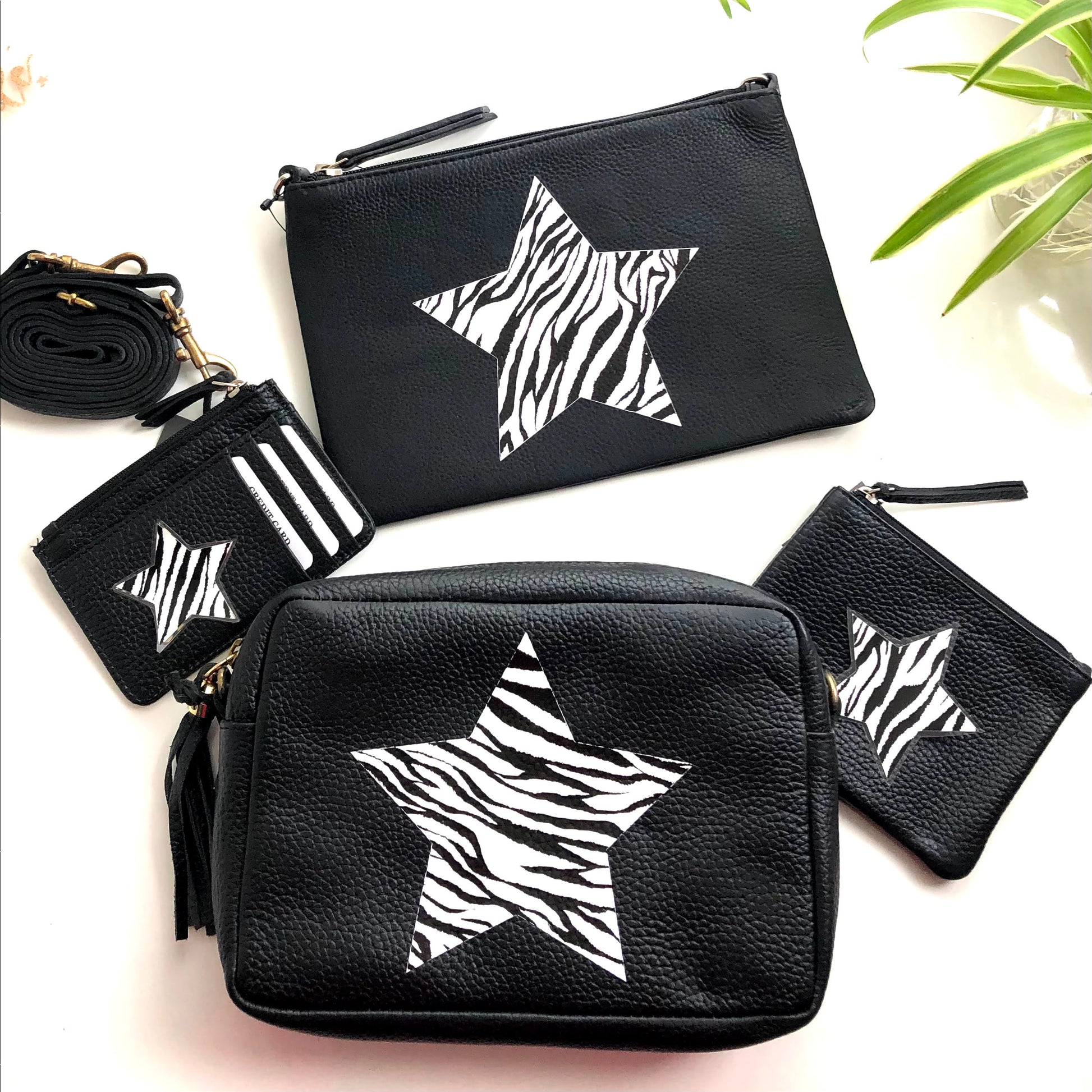 Elevate your outfit with this zebra print star genuine leather camera bag.