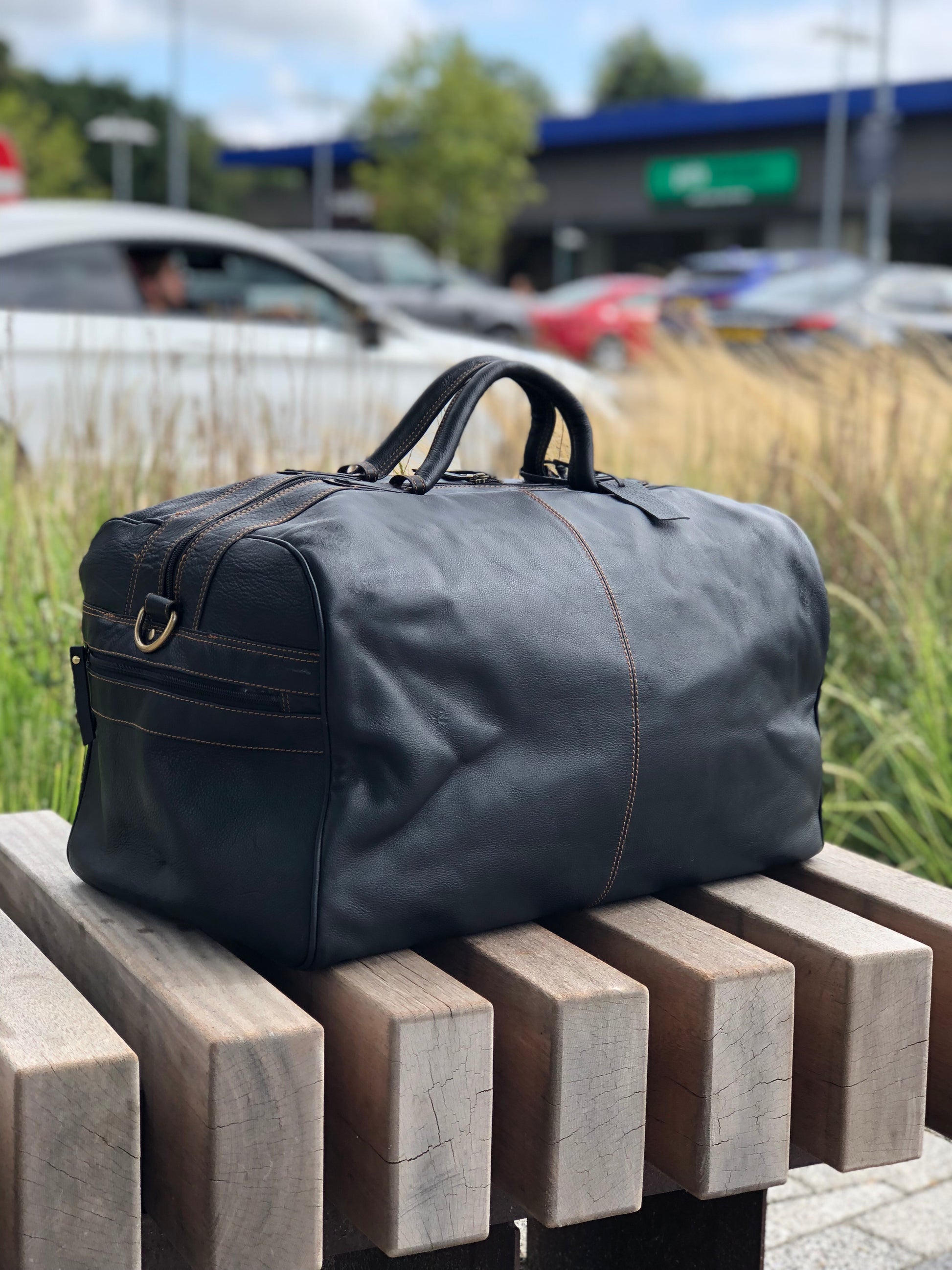 Grained leather duffel bag with detailed stitching that enhances the look of the bag. A wonderful, stylish, strong and sturdy bag for travelling.
