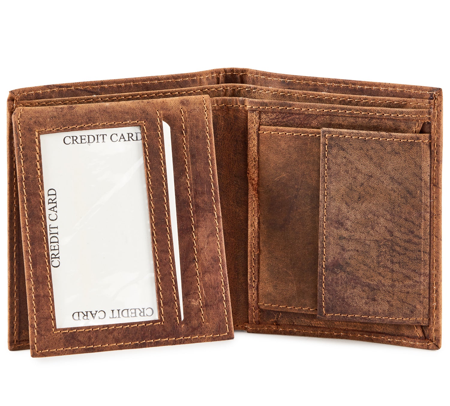 Distressed leather wallet with 7 card slots, 2 photo section and 2 note sections and a coin pocket.