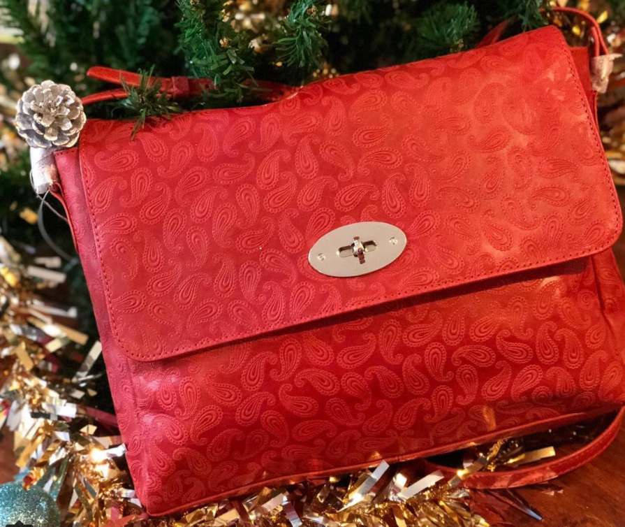 Beautifully embossed paisley in red leather enhances the look of this shoulder bag. It is lined on the inside with useful zipped pocket and open phone pockets.